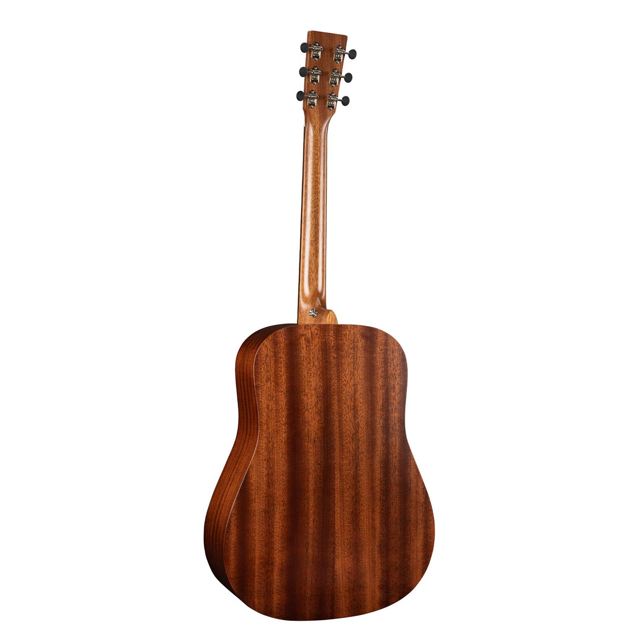 Su construcción totalmente de madera sólida y acabado satinado, combina una tapa frontal de caoba con lados y fondo de sapele, lo que refuerza ese carácter “maderoso” y envolvente del sonido. Los refuerzos en X de abeto, proporcionan una voz enfocada y equilibrada, mientras que el cuerpo tipo Dreadnought aporta volumen, proyección y presencia en la mezcla.