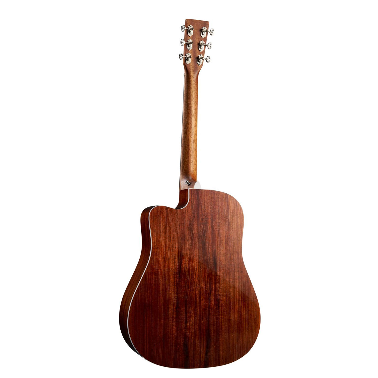 La Martin DC-13E Modern es una guitarra electroacústica pensada para músicos que buscan potencia, presencia escénica y un enfoque contemporáneo del sonido acústico. Su cuerpo Dreadnought con cutaway (D-14 Fret) ofrece gran volumen y proyección, ideal para acompañamientos contundentes y rasgueos expresivos, mientras que el cutaway permite acceder cómodamente a los trastes altos cuando el arreglo lo exige. La combinación de tapa sólida de abeto con fondo y aros de koa fine veneer entrega un tono claro y balanceado, con agudos brillantes, medios definidos y un sustain largo y uniforme que se mantiene consistente tanto en acústico como amplificado.